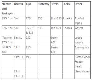 Directions Health Services primary NSPs provide an extended range of sterile injecting equipment (see table below) and other services to people who inject drugs including information and education, crisis support, brief interventions and referrals to health and social services. A crisis support worker is available 9am – 5pm, Monday to Friday at the Civic NSP outlet to provide support regarding housing, legal, treatment and other issues. NSP raining for health workers and harm reduction advice is also available. A Practice Nurse from Directions Health is available weekly at NSP Civic to provide free health checks and referrals.